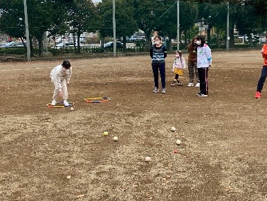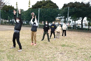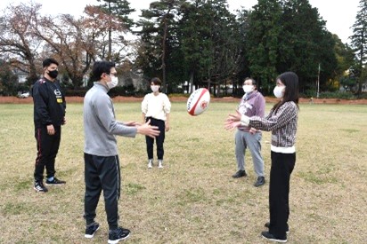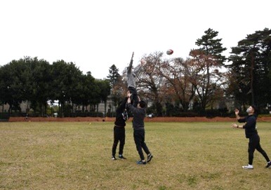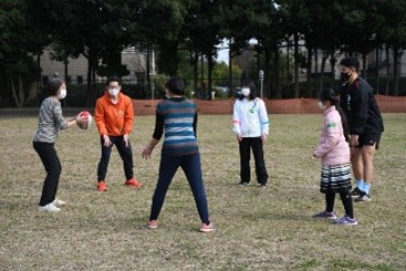 日本人と外国ルーツの人が30人ぐらい集まって、ラグビー、クウェペナ、ペタンクというスポーツをしました。みんなでいろいろな国のスポーツをわいわいと楽しみました♪ 今回は日野レッドドルフィンズのラグビー選手の人たちにラグビーボールの持ち方や投げ方を楽しく習いました。とてもいい経験でした♪ |