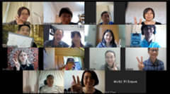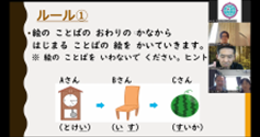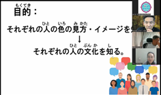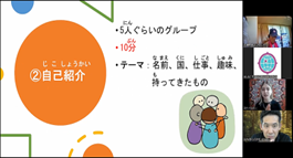 | 内容 | ZOOMのルームに日本だけでなく、世界からいろいろな人が集まって、交流しました。今回は自分の部屋にある好きな物や大切な物を紹介したり、日本語のゲーム「絵しりとり」でがんばって絵をかきながら、楽しく遊んだりしました。また、「色」をテーマにおしゃべりをして、それぞれの人の考え方や文化を発見していました。 |