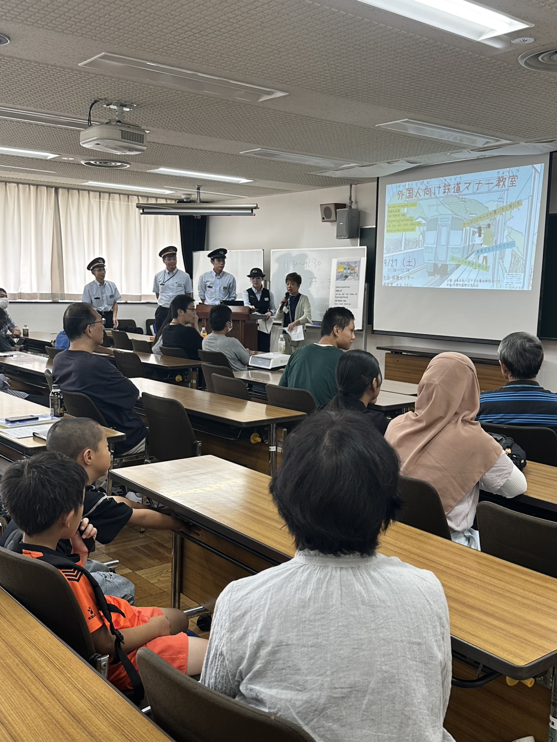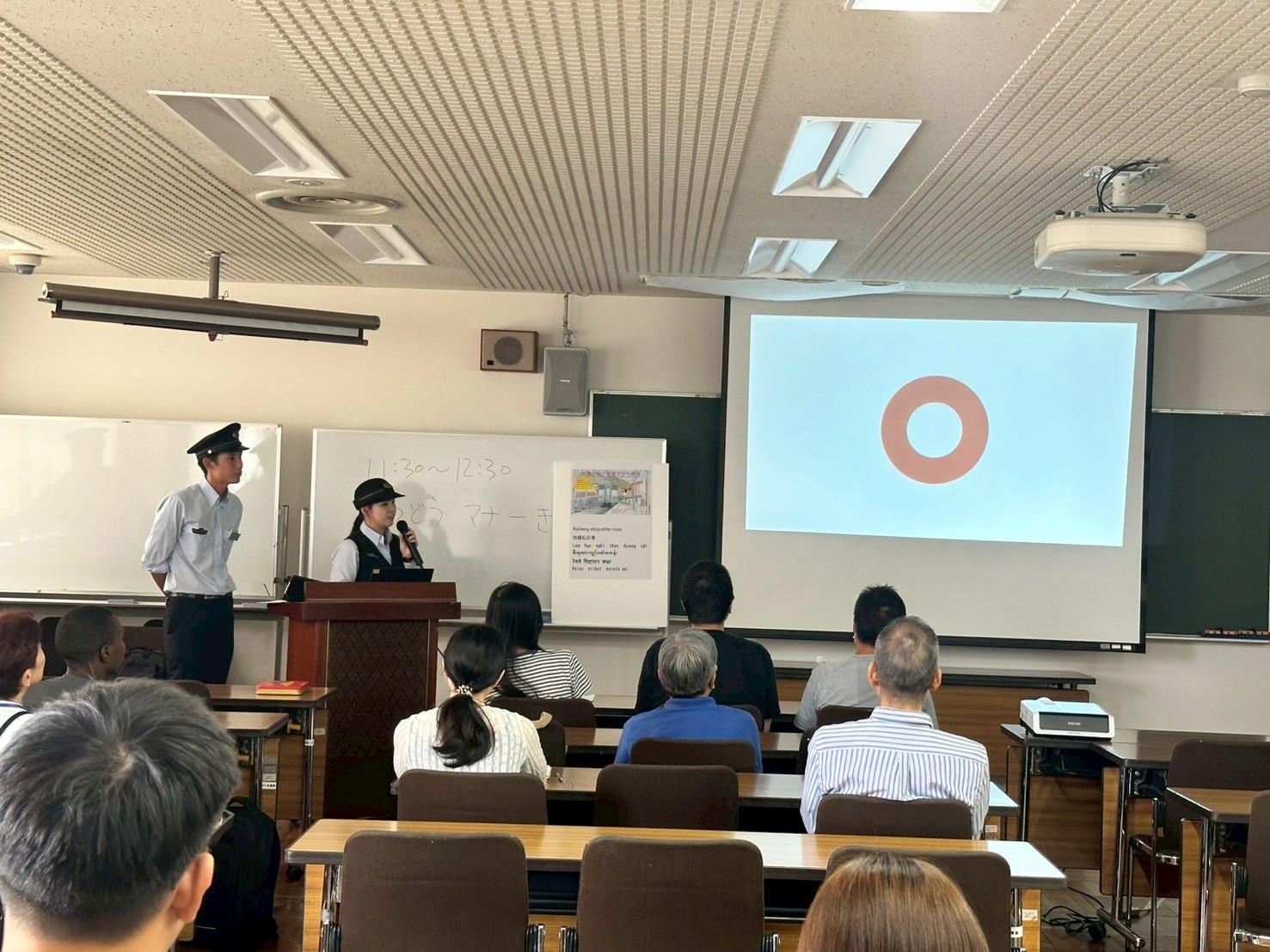 JR東日本八王寺支社豊田統括センター地域連駅ユニットのスタッフの皆さんにお越しいただき、日本に暮らす外国籍の方に知っておいてもらいたい鉄道を利用する際のマナーについて学んだ。