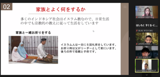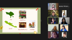 | 内容・感想 | HIFAとインドネシアの「IPBチレボン大学」でオンラインの国際交流イベントをしました。まずグループで自己紹介をしました。インドネシアの大学生は日本の文化、特にアニメ・まんがなどに興味があることや「日本へ行きたい」という気持ちなどを話していました。それから、インドネシアの大学の学生と先生にインドネシアの文化を紹介してもらいました。イスラム教のお祈り、食事の仕方や地域の料理、「ナドラン」という漁の祭りなどいろいろな文化を知りました。 アンケートでは「日本人や中国人と日本語で話して、日本語の勉強を頑張ろうと思いました」「インドネシアの料理や生活などいろいろ勉強になりました」「お互いに文化を知り合って、仲良くできます。このイベントが続いてほしいです」など喜びの声がありました。また、いつかこのように世界の人と交流するイベントをしたいと思います。 |