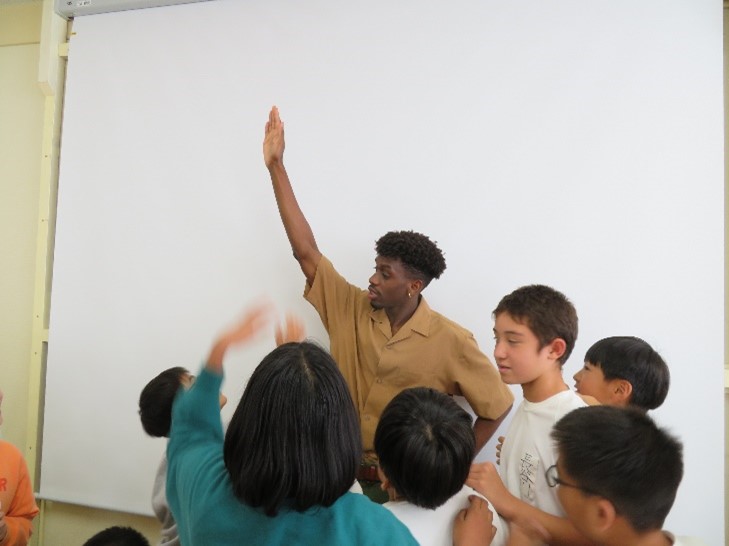 | 内容 | 陳 エミさん(中国)とチーチー ピュー トゥエさん(ミャンマー)とジャベルソン ジーンさん(アメリカ)が、夢が丘小学校の5年生の授業に参加しました。 自分の国の紹介や日本と自分の国の違うところを説明したあとで、子どもたちの質問に答えて交流しました。 授業が終わったら、子どもたちと仲良くなれました。 |