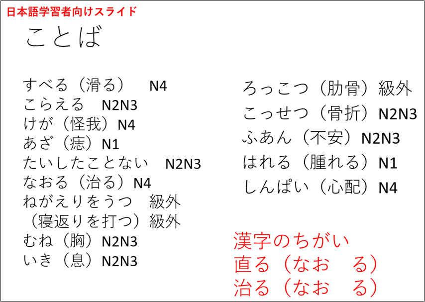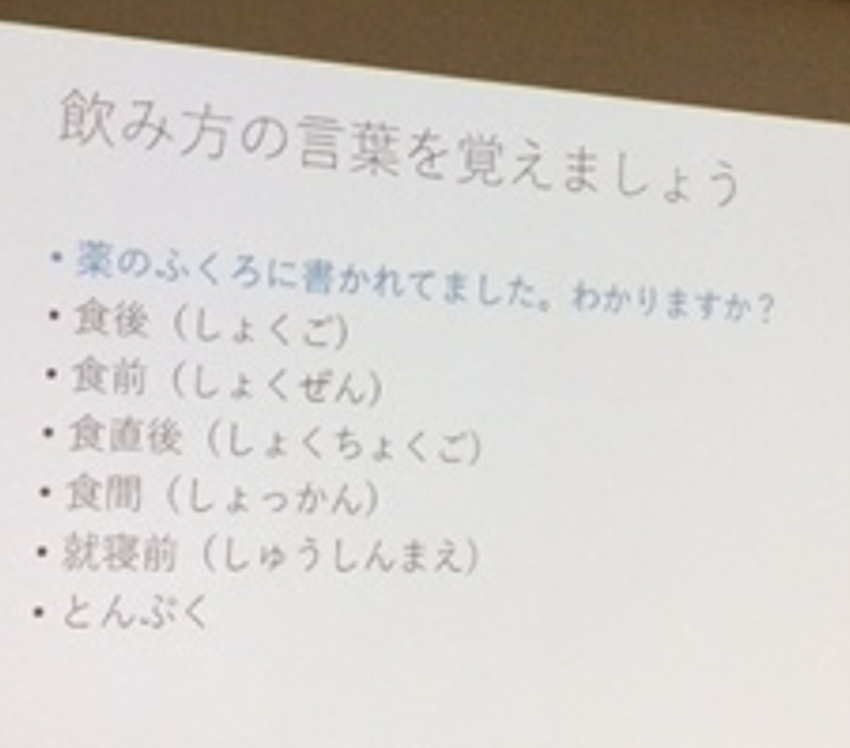 内容 日本人は医療に関する日本語をやさしい日本語に言い換える練習をしました。外国ルーツのかたは難しい日本語や言い換えた後のやさしい日本語が分かるかどうか確認しました。病院の選び方や、症状の確認方法、薬について情報共有をしました。 感想:ロールプレイや薬の実物を確認しての説明など、単なる練習会としてだけではなく、情報共有やコミュニケーションの場として楽しい会でした。 使った言葉をリーディングチュウ太で日本語能力試験のレベルを確認したり、日本語学習者へ聞いてみると、「寝返りを打つ」などは難しい言葉であるということが分かった。日本の漢字と中国の漢字の違いなどを知る機会にもなり勉強になった。 |