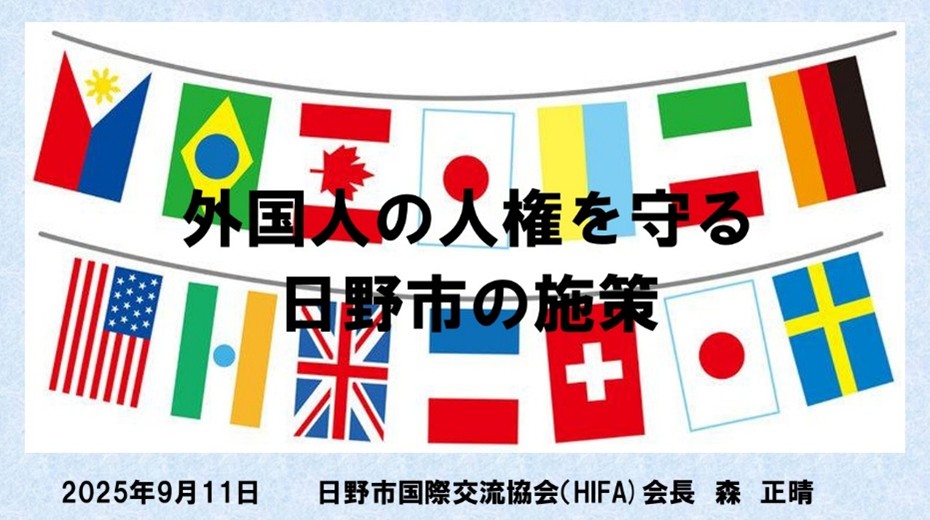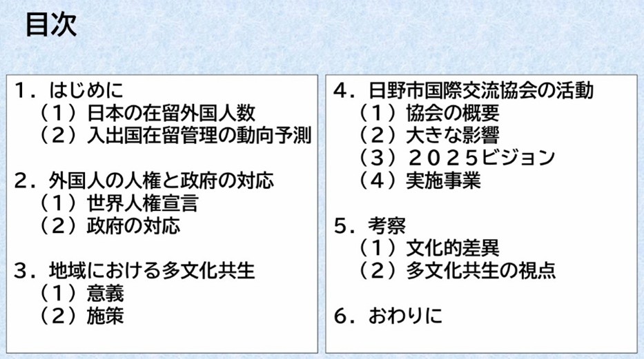 講義の内容の3.地域における多文化共生と4.日野市国際交流協会の活動については、