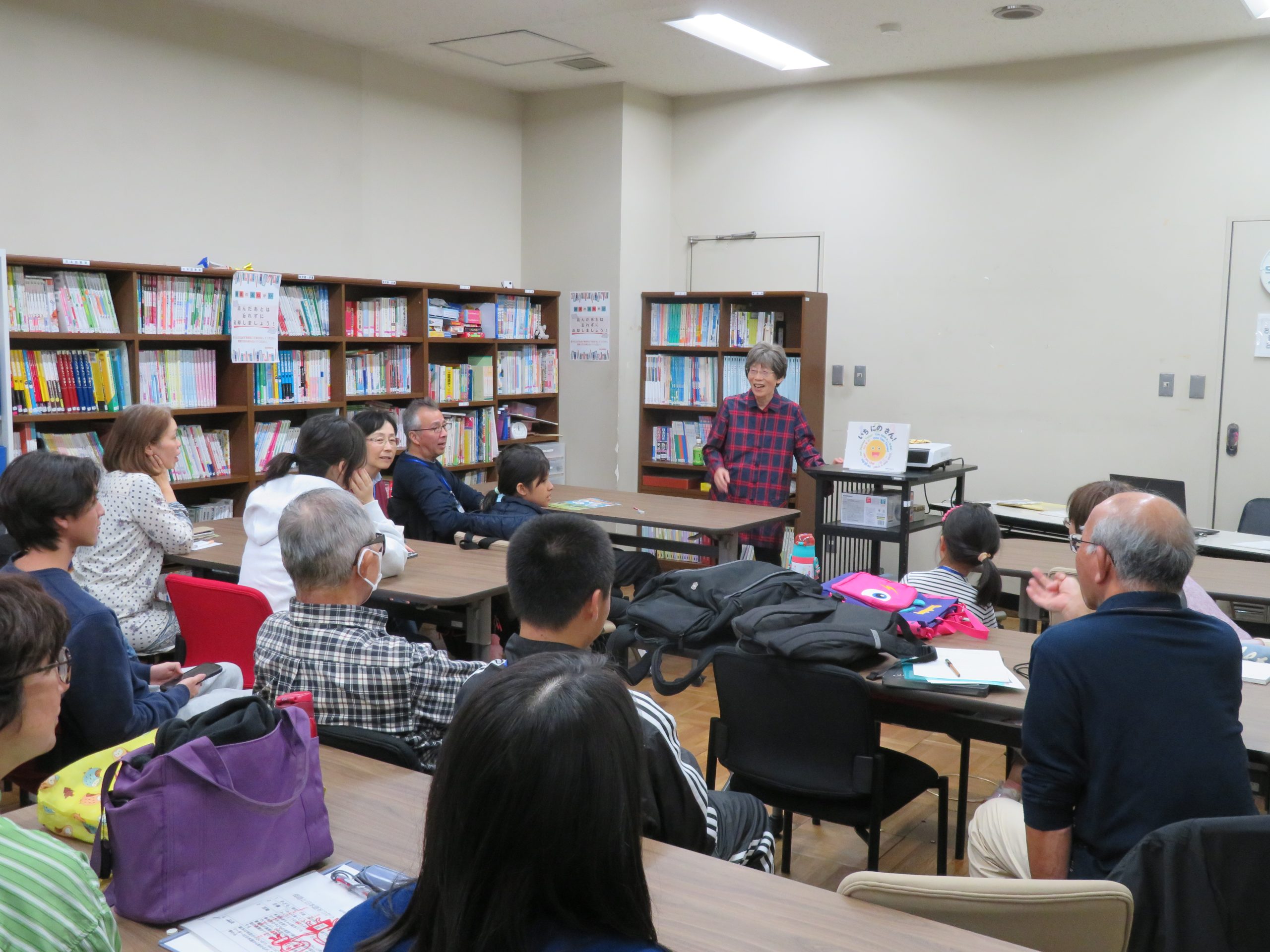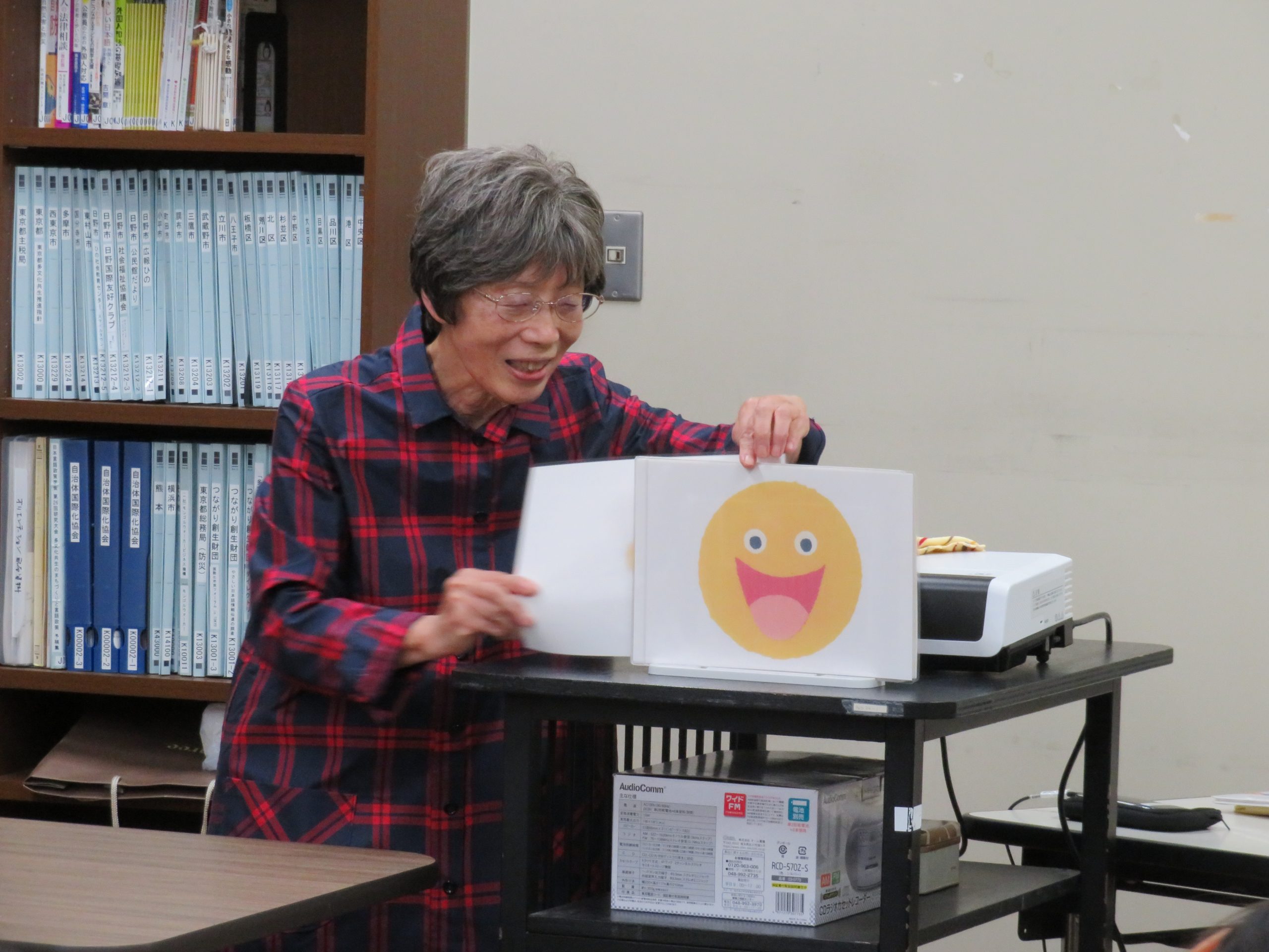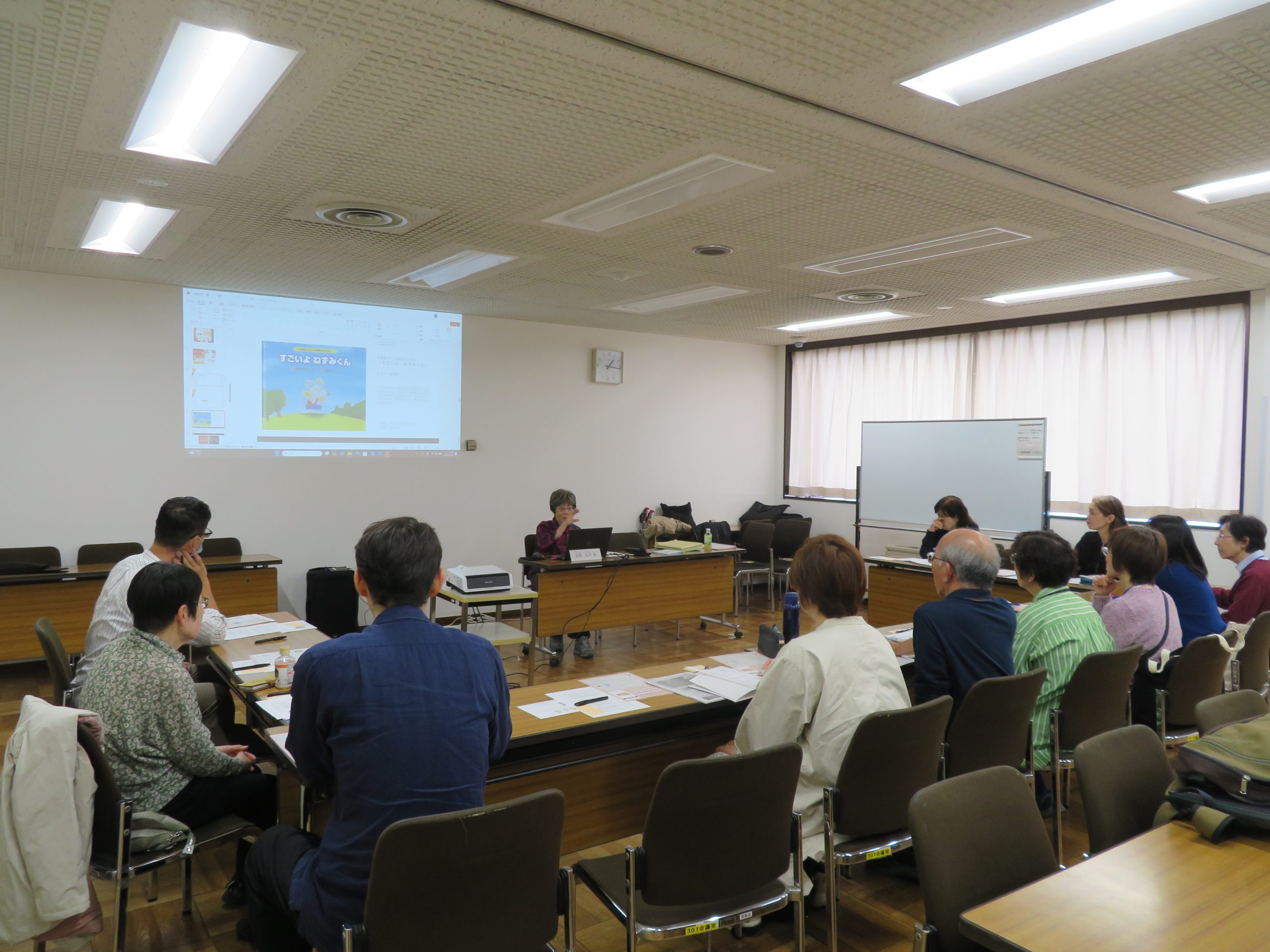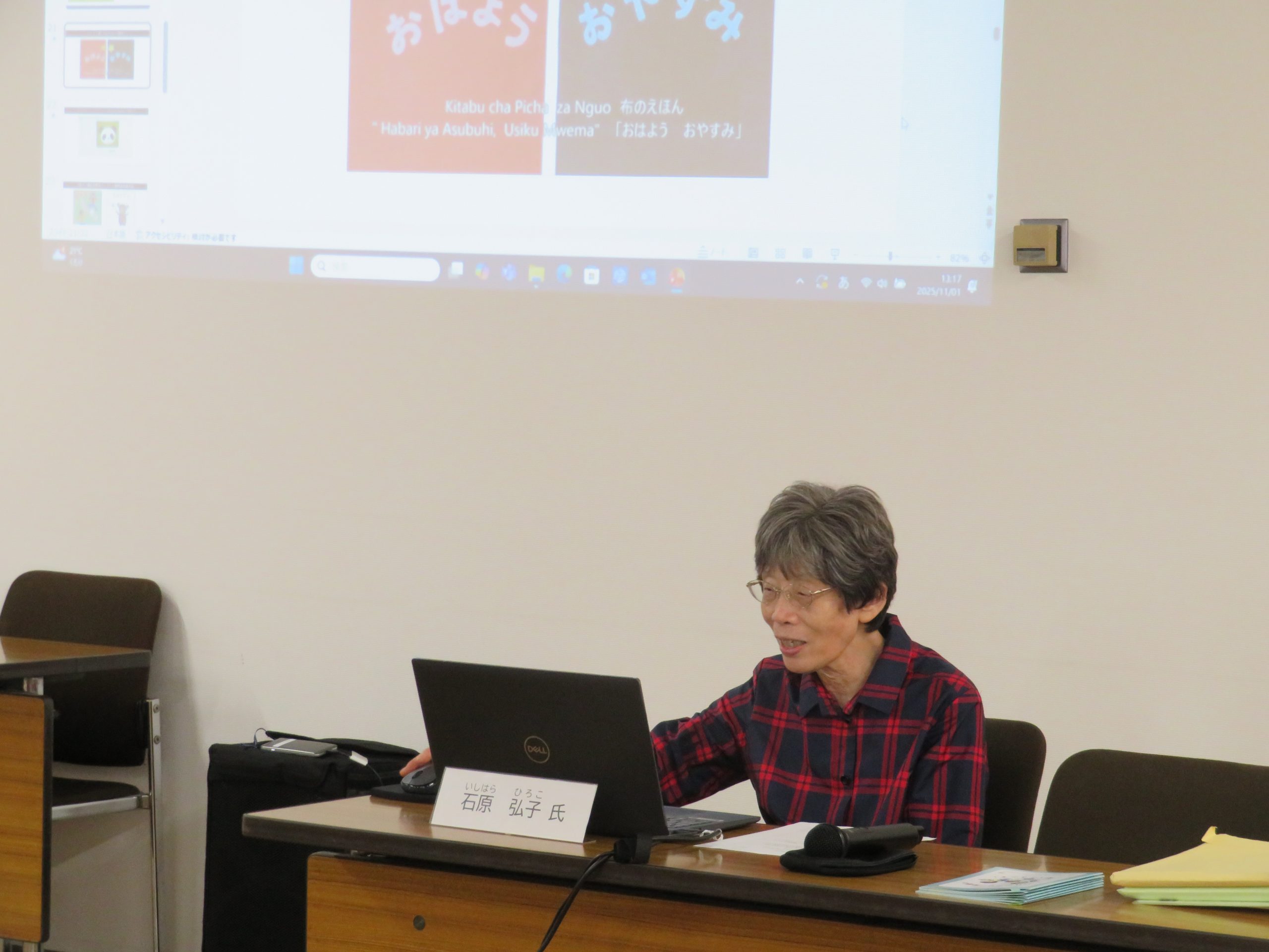 午後の部では、講師が主催するRAINBOWの活動紹介、「外国語でうたう子どもの歌」など母語に触れられる資料の紹介などがあった。 講師:石原弘子氏(多言語絵本の会RAINBO) |