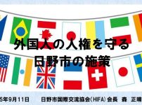 日野市教育委員会のイベントで会長が講義 日野市教育委員会主催の「令和7年 第3回人権教育委員会」が、2025年9月11日(木)に、日野市教育センターにおいて開催されました。 参加者は、日野市立幼稚園・小学校・中学校の人権教育推進委員の教師及び管理職で、約30名でした。日野市国際交流協会からは、会長と事務局長が参加し、その中で、「外国人の人権を守る日野市の政策」をテーマに、会長が講義をしました。 講義の内容の3.地域における多文化共生と4.日野市国際交流協会の活動については、 エコーレター9月号を配布し、掲 ...